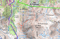 - En auto-navette depuis le posé par le versant ouest et le sentier des chasseurs. Quitter le sentier vers l'altitude 1890m pour traverser le torrent (au printemps possibilité de tirer jusqu'au lac de Fangeas pour traverser plus facilement) et se diriger vers une ligne de faiblesse dans la Grande Barre indiquée sur la carte IGN. Remonter le profond couloir (un pas de 3 et un autre ressaut raide) jusqu'à la crête, puis redescendre jusqu'au sommet de Gramusat. 2h jusqu'à l'arête entre Gramusat (2445m) et le Piquet (2750m), 15min de descente jusqu'à l'exit. 1200D+ environ, et 200D-.